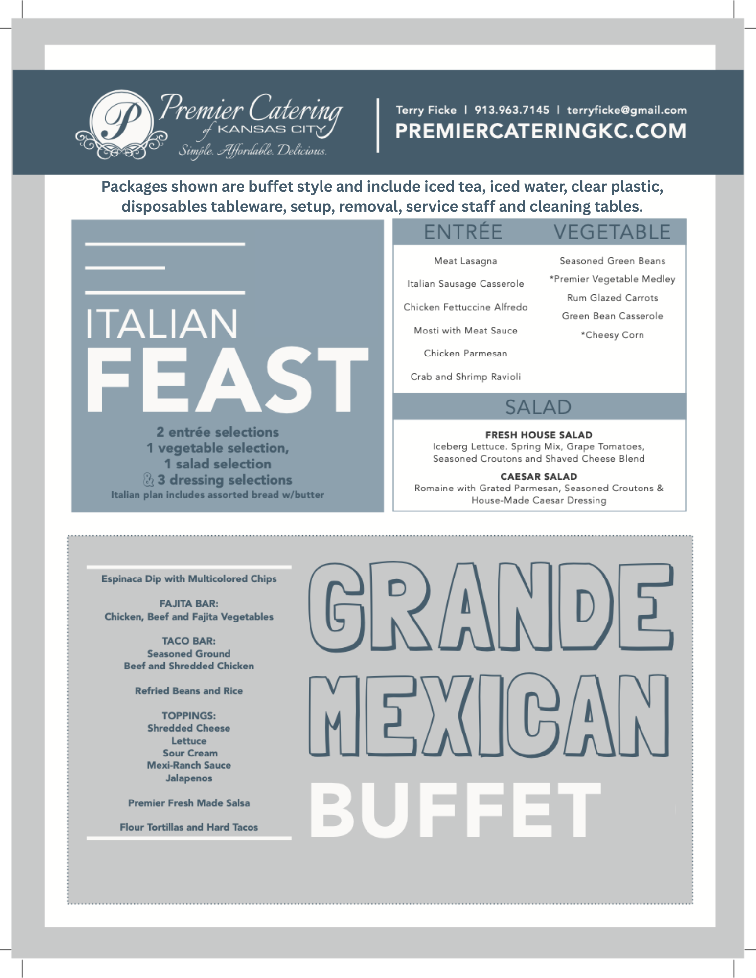 * Packages shown are buffet style and include iced tea, iced water, clear plastic, disposables tableware, setup, removal, service staff and cleaning tables.