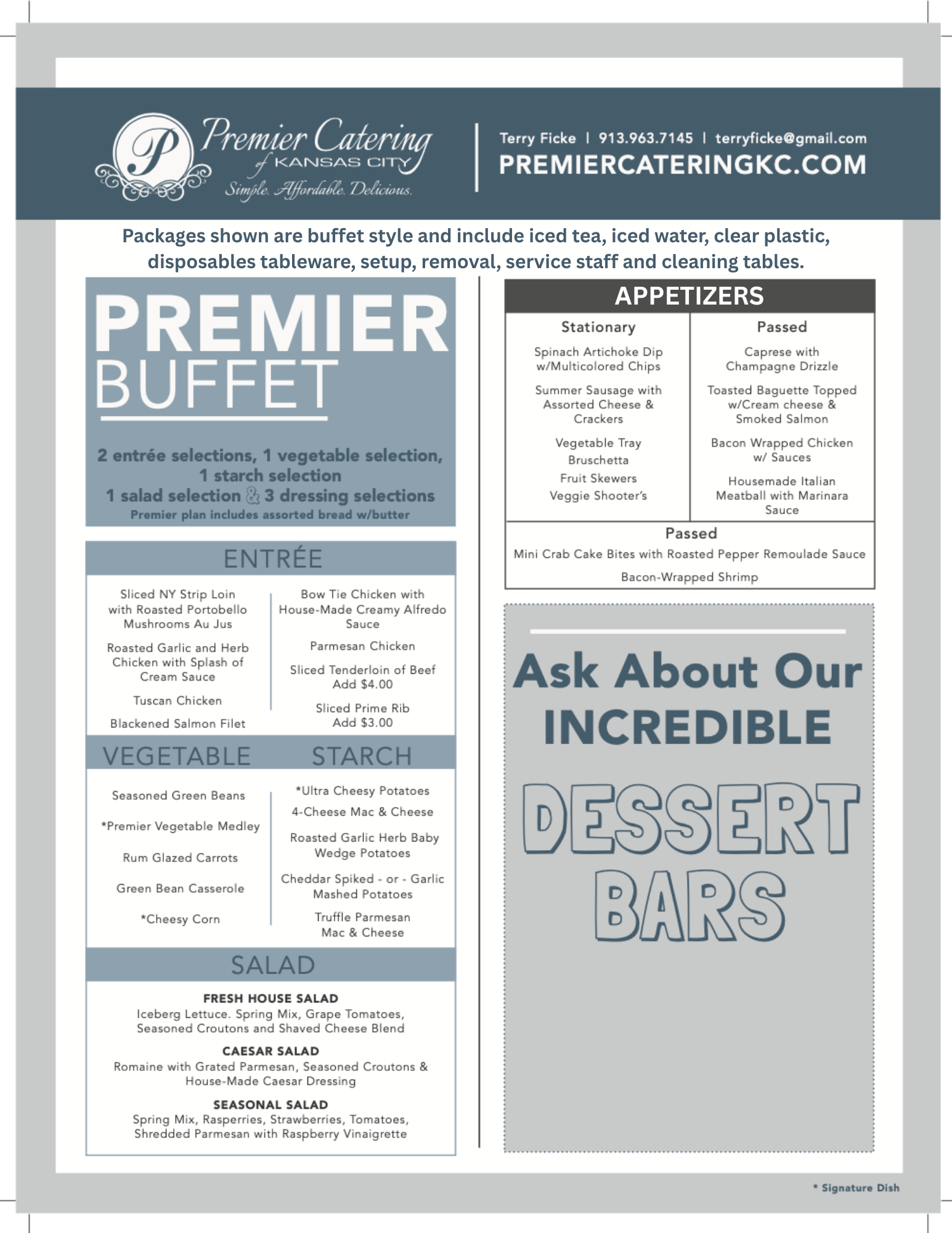 For anyone that may be unfamiliar with our business, we would like to provide some quick background information. Premier Catering of Kansas City is owned and managed by Terry Ficke. Over the years, we’ve been honored to cater quite a few weddings across the Kansas City area and many of the surrounding cities. We truly do take pride in not only catering delicious food, but also providing the best value in all of KC!